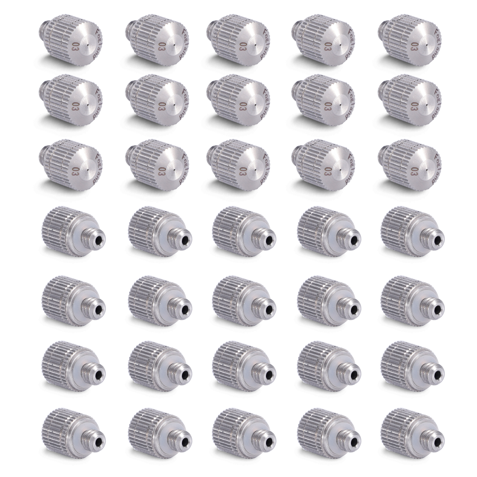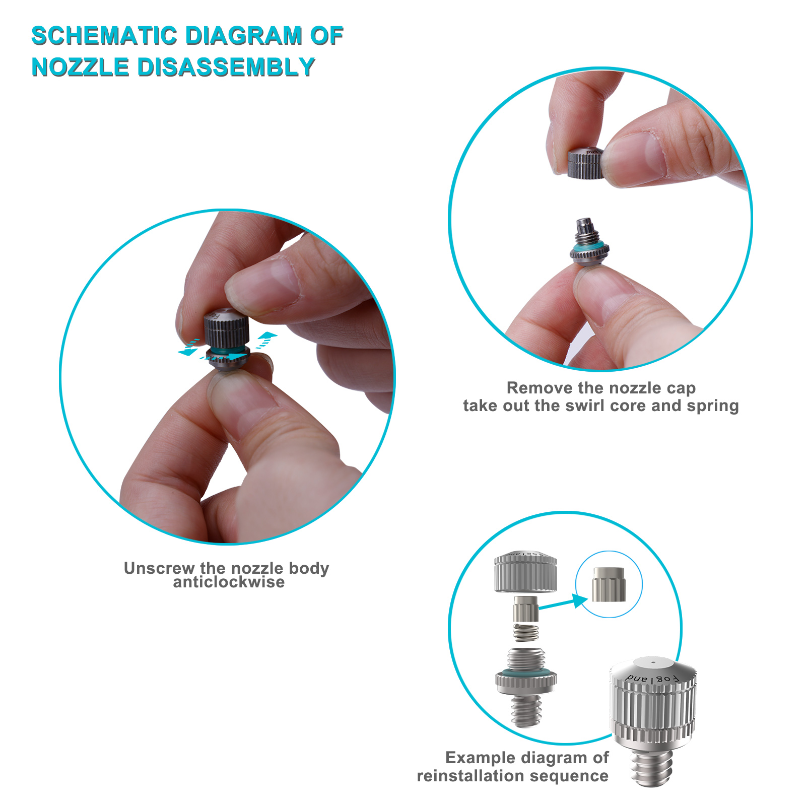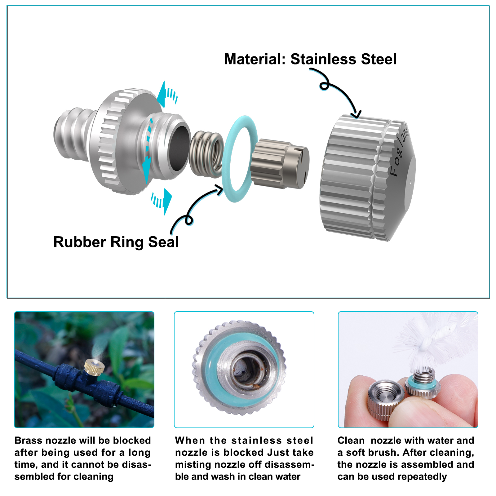 [Anti-clogging]: Fogland stainless steel misting nozzle adopts a detachable body design and has an anti-clogging function. When a smaller flow rate or bad spray performance of the misting nozzle is due to the clogging problem, just disassemble the nozzle and clean it under running water with a soft brush. Cleanable and reusable nozzles save you money!