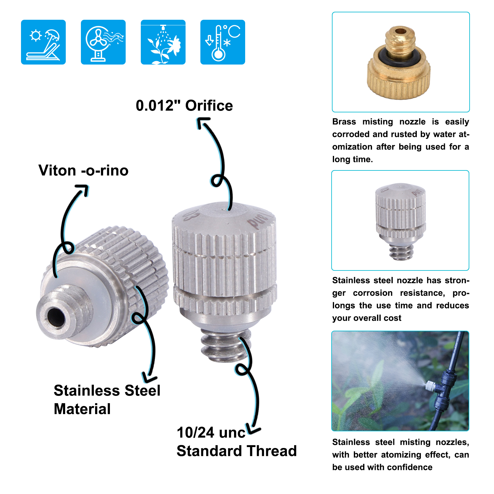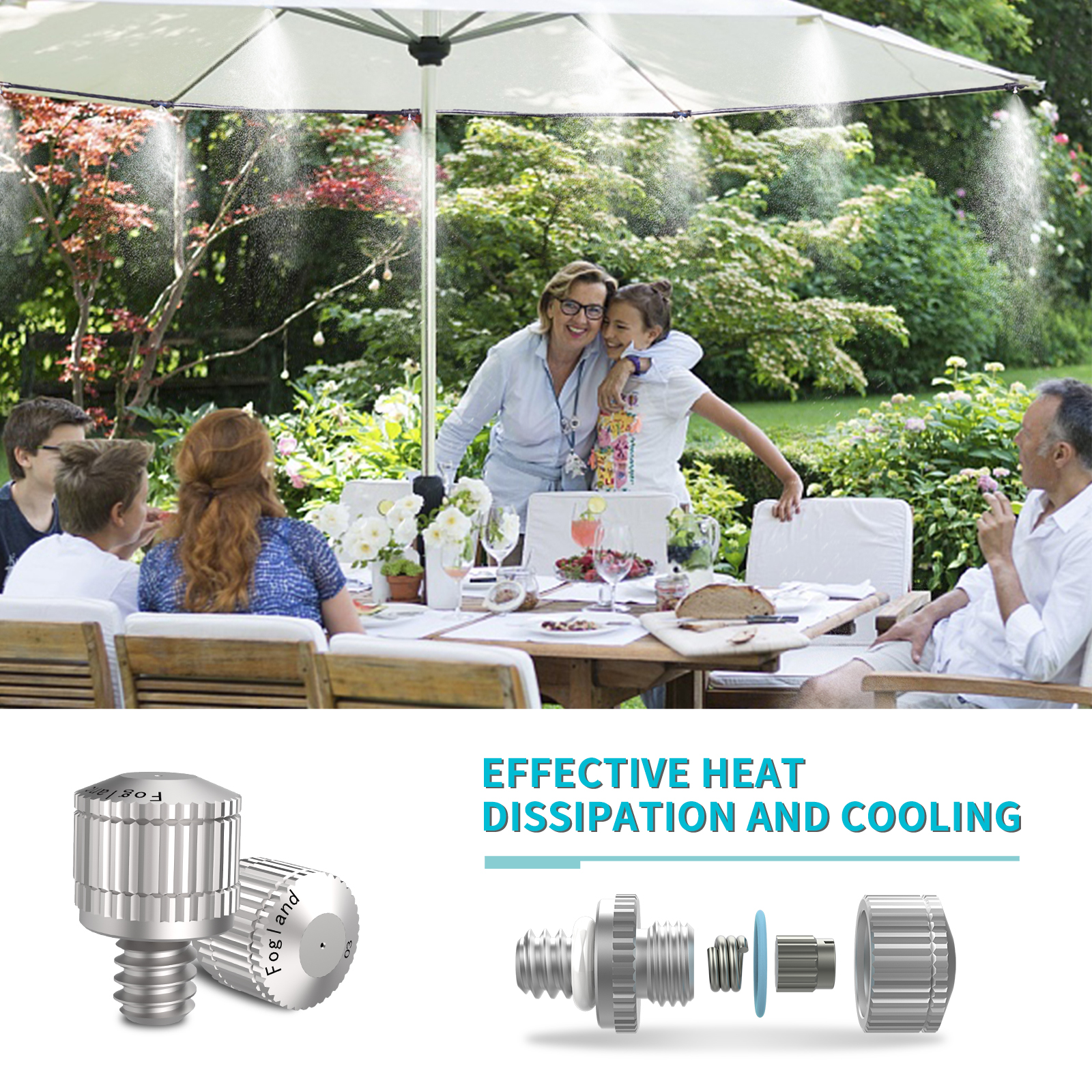 [Multi-purpose]: Fogland outdoor misting nozzle is versatile, suitable for 10/24UNC or 3/16" Threads, and can be used on misting cooling systems and misting fans, or as spare parts to replace other nozzles.